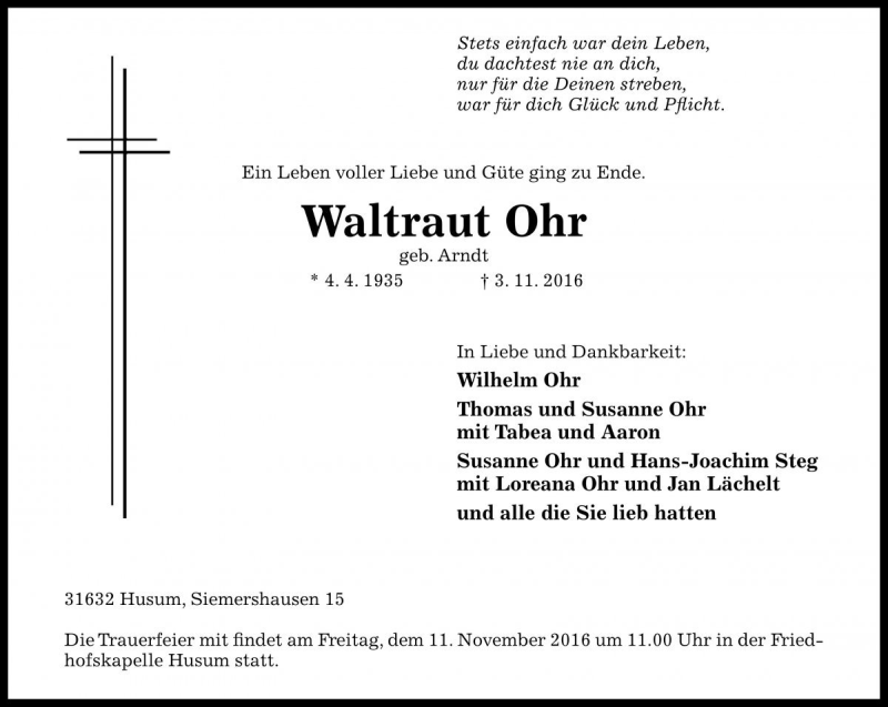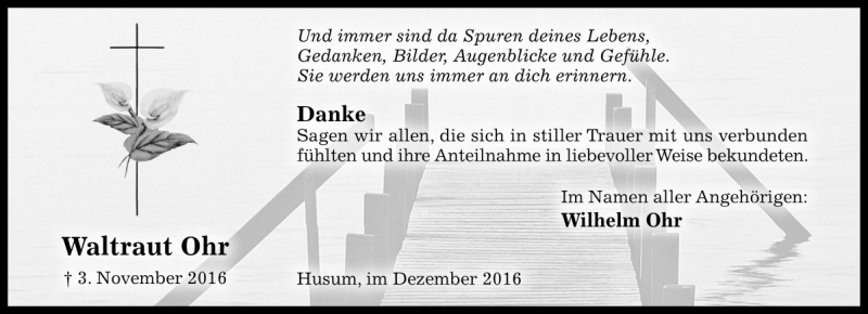 Hier finden Sie alle Traueranzeigen aus der Zeitung, die bisher für Waltraut Ohr erschienen sind. Weitere Traueranzeigen, die in der Zeitung erscheinen, werden hier ebenfalls aufgelistet