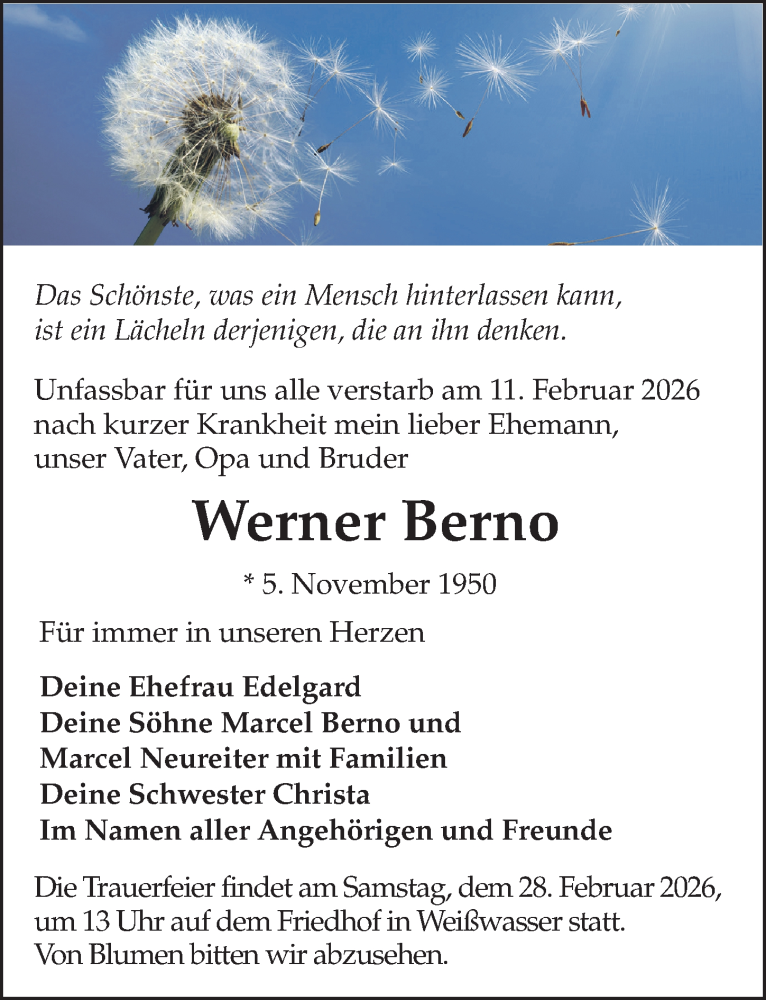 Hier finden Sie alle Traueranzeigen aus der Zeitung, die bisher für Werner Berno erschienen sind. Weitere Traueranzeigen, die in der Zeitung erscheinen, werden hier ebenfalls aufgelistet