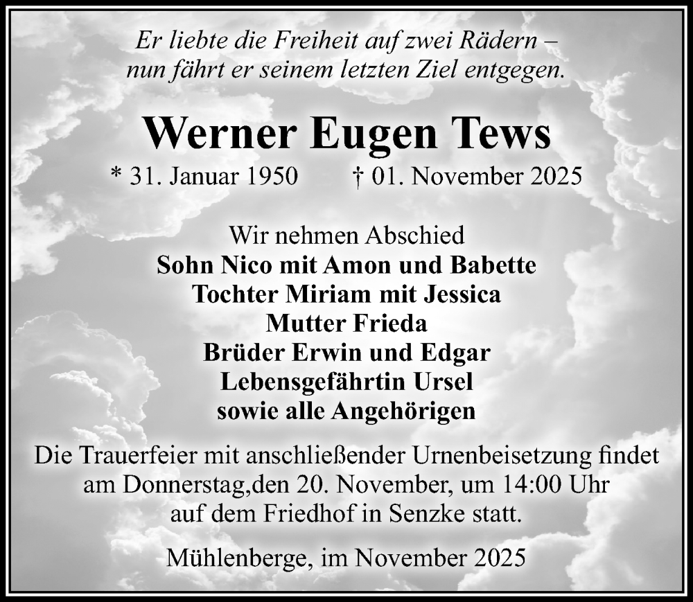 Hier finden Sie alle Traueranzeigen aus der Zeitung, die bisher für Werner Eugen Tews erschienen sind. Weitere Traueranzeigen, die in der Zeitung erscheinen, werden hier ebenfalls aufgelistet