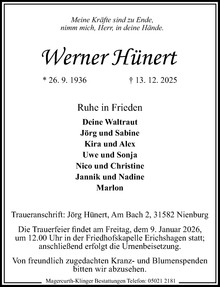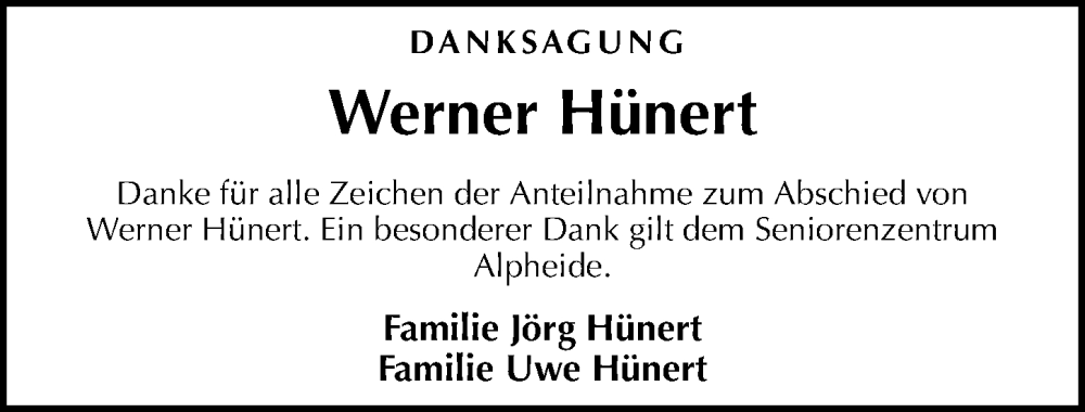 Hier finden Sie alle Traueranzeigen aus der Zeitung, die bisher für Werner Hünert erschienen sind. Weitere Traueranzeigen, die in der Zeitung erscheinen, werden hier ebenfalls aufgelistet
