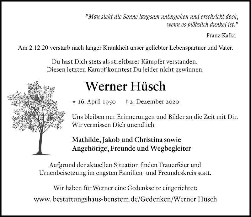 Hier finden Sie alle Traueranzeigen aus der Zeitung, die bisher für Werner Hüsch erschienen sind. Weitere Traueranzeigen, die in der Zeitung erscheinen, werden hier ebenfalls aufgelistet