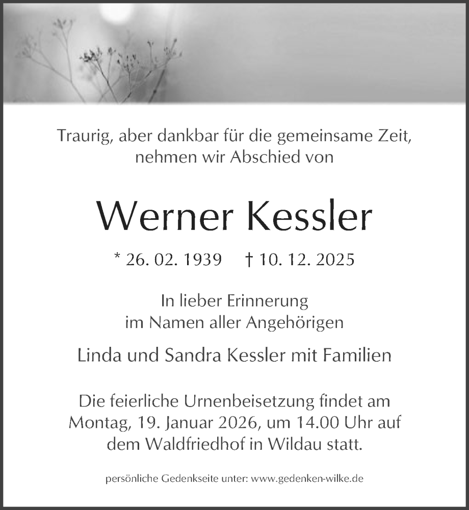 Hier finden Sie alle Traueranzeigen aus der Zeitung, die bisher für Werner Kessler erschienen sind. Weitere Traueranzeigen, die in der Zeitung erscheinen, werden hier ebenfalls aufgelistet