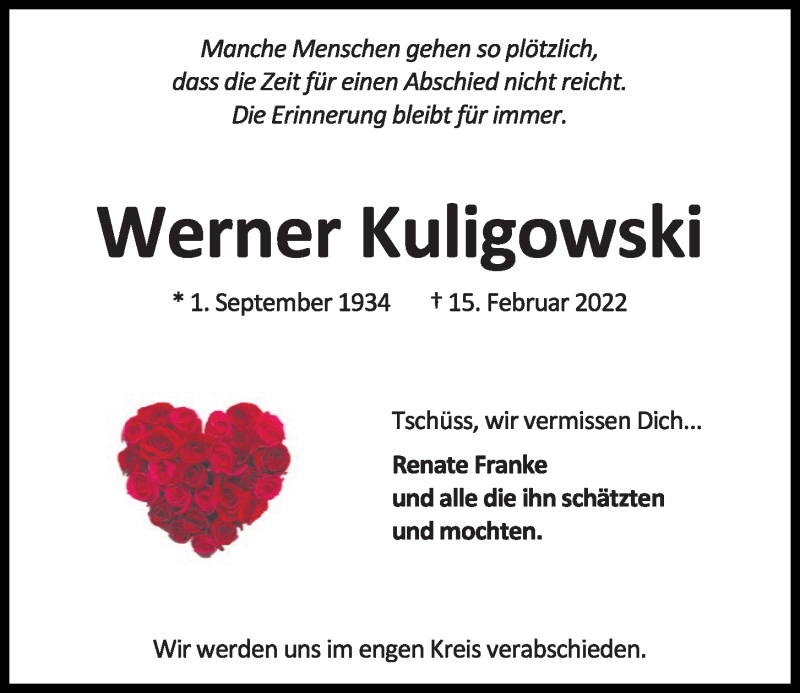 Hier finden Sie alle Traueranzeigen aus der Zeitung, die bisher für Werner Kuligowski erschienen sind. Weitere Traueranzeigen, die in der Zeitung erscheinen, werden hier ebenfalls aufgelistet