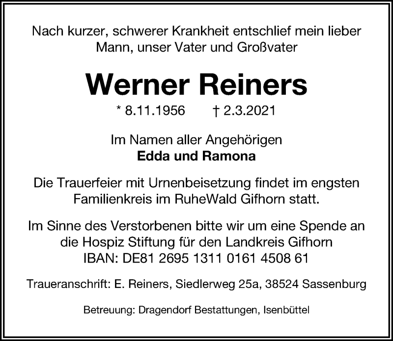 Hier finden Sie alle Traueranzeigen aus der Zeitung, die bisher für Werner Reiners erschienen sind. Weitere Traueranzeigen, die in der Zeitung erscheinen, werden hier ebenfalls aufgelistet