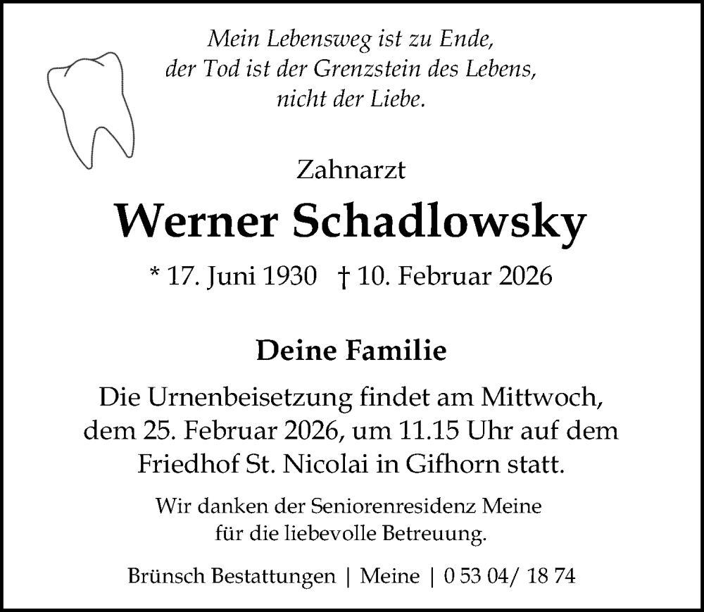 Hier finden Sie alle Traueranzeigen aus der Zeitung, die bisher für Werner Schadlowsky erschienen sind. Weitere Traueranzeigen, die in der Zeitung erscheinen, werden hier ebenfalls aufgelistet
