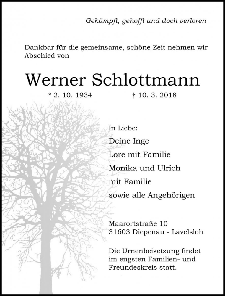 Hier finden Sie alle Traueranzeigen aus der Zeitung, die bisher für Werner Schlottmann erschienen sind. Weitere Traueranzeigen, die in der Zeitung erscheinen, werden hier ebenfalls aufgelistet