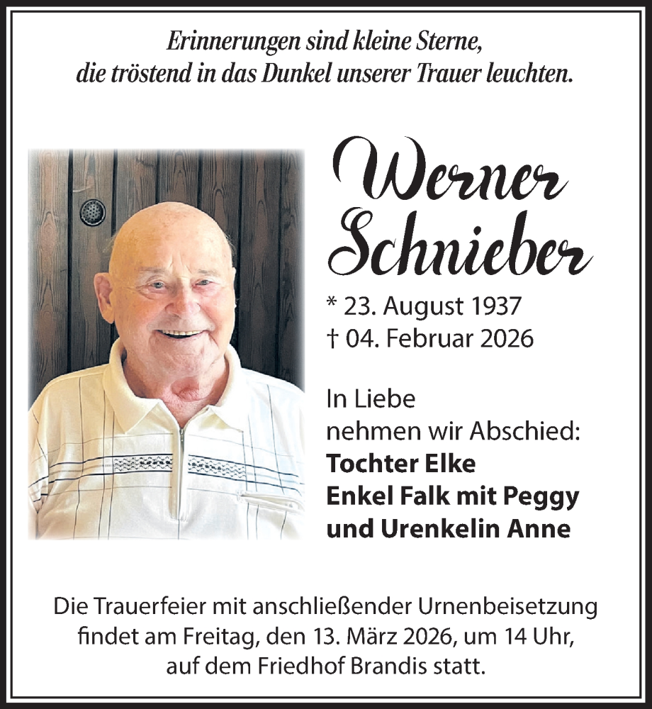 Hier finden Sie alle Traueranzeigen aus der Zeitung, die bisher für Werner Schnieber erschienen sind. Weitere Traueranzeigen, die in der Zeitung erscheinen, werden hier ebenfalls aufgelistet