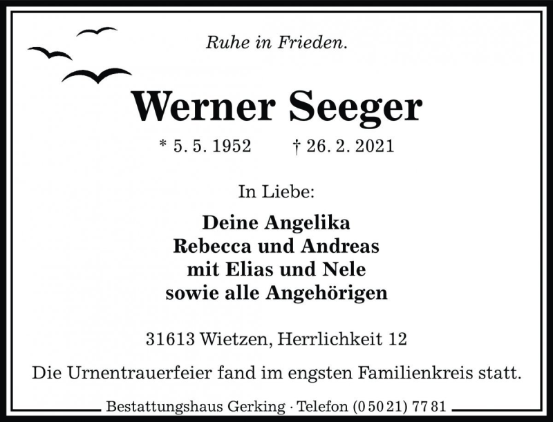 Hier finden Sie alle Traueranzeigen aus der Zeitung, die bisher für Werner Seeger erschienen sind. Weitere Traueranzeigen, die in der Zeitung erscheinen, werden hier ebenfalls aufgelistet