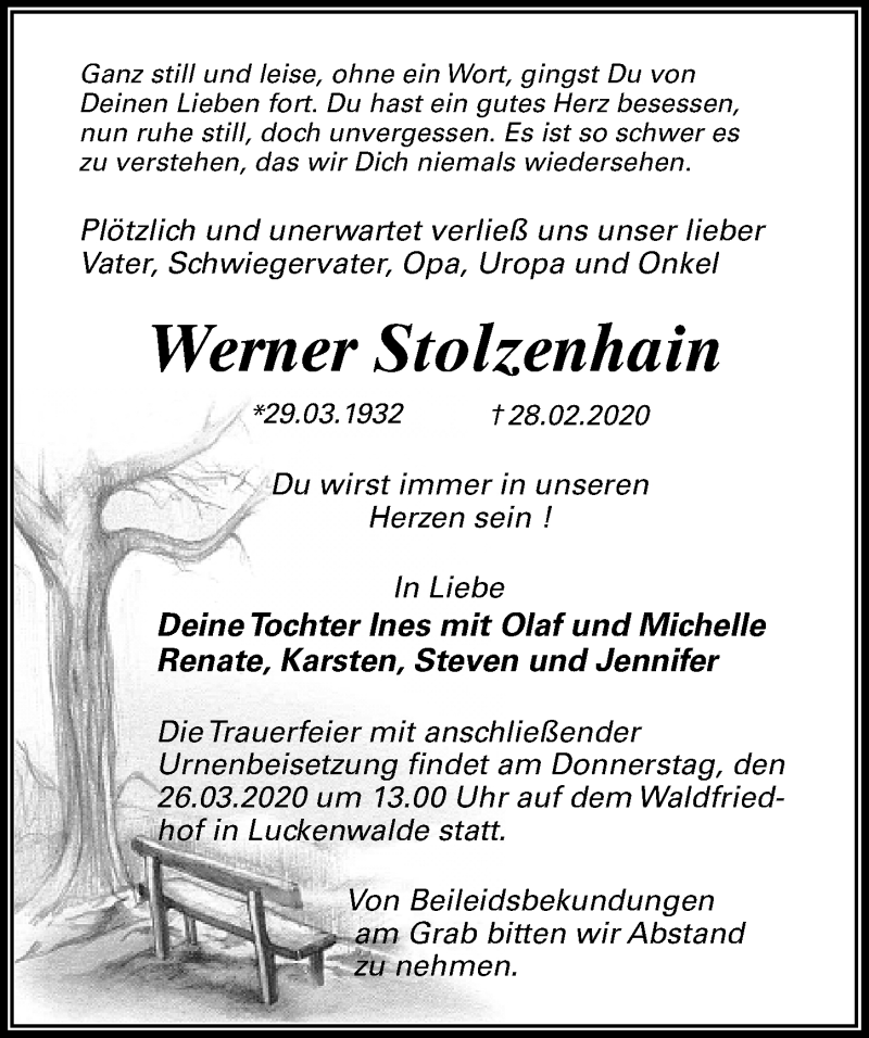 Hier finden Sie alle Traueranzeigen aus der Zeitung, die bisher für Werner Stolzenhain erschienen sind. Weitere Traueranzeigen, die in der Zeitung erscheinen, werden hier ebenfalls aufgelistet