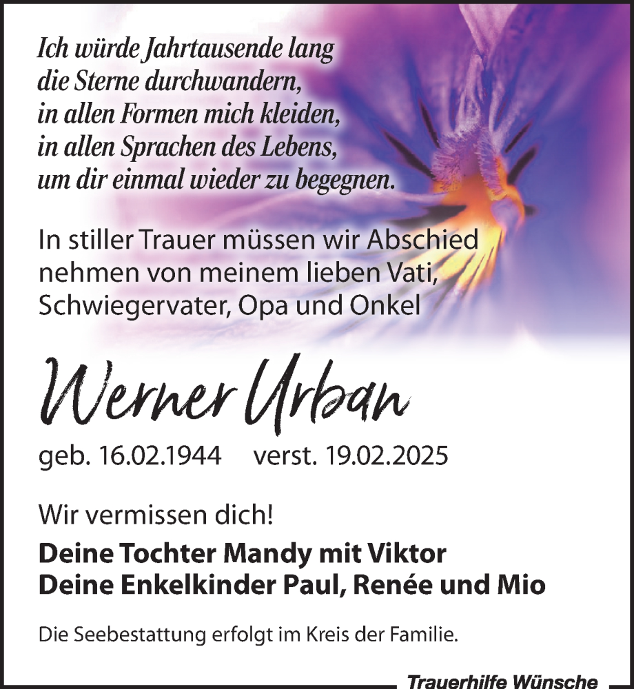 Hier finden Sie alle Traueranzeigen aus der Zeitung, die bisher für Werner Urban erschienen sind. Weitere Traueranzeigen, die in der Zeitung erscheinen, werden hier ebenfalls aufgelistet