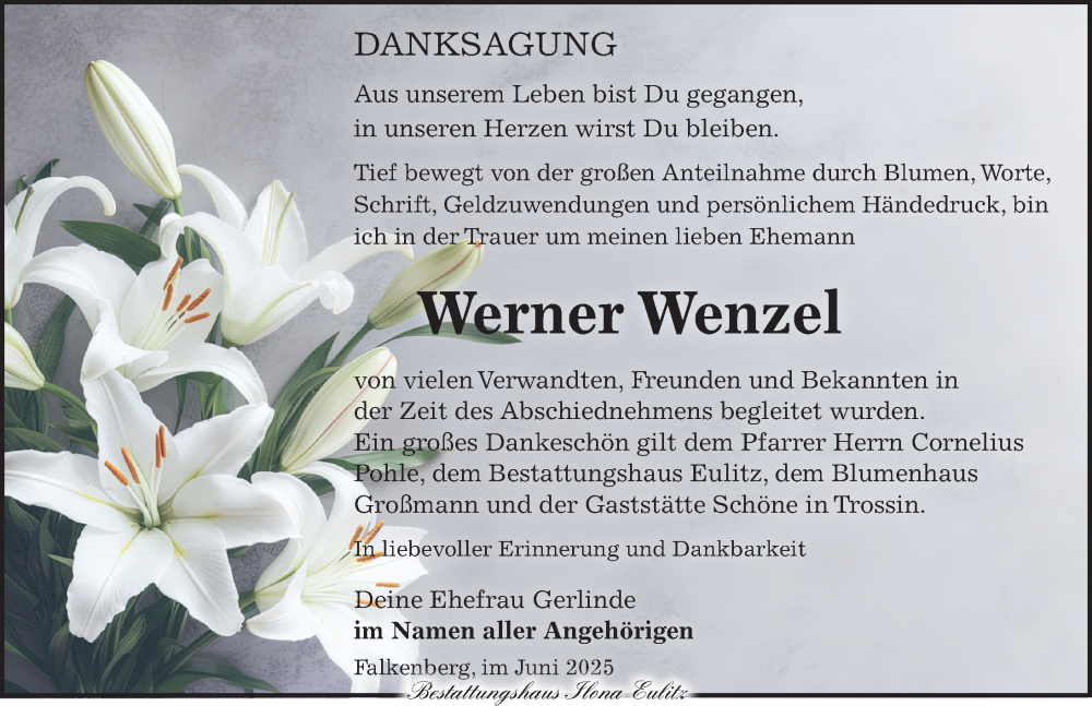 Hier finden Sie alle Traueranzeigen aus der Zeitung, die bisher für Werner Wenzel erschienen sind. Weitere Traueranzeigen, die in der Zeitung erscheinen, werden hier ebenfalls aufgelistet