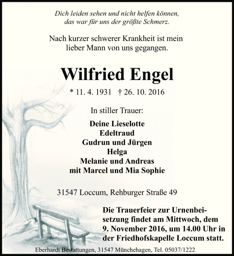 Hier finden Sie alle Traueranzeigen aus der Zeitung, die bisher für Wilfried Engel erschienen sind. Weitere Traueranzeigen, die in der Zeitung erscheinen, werden hier ebenfalls aufgelistet