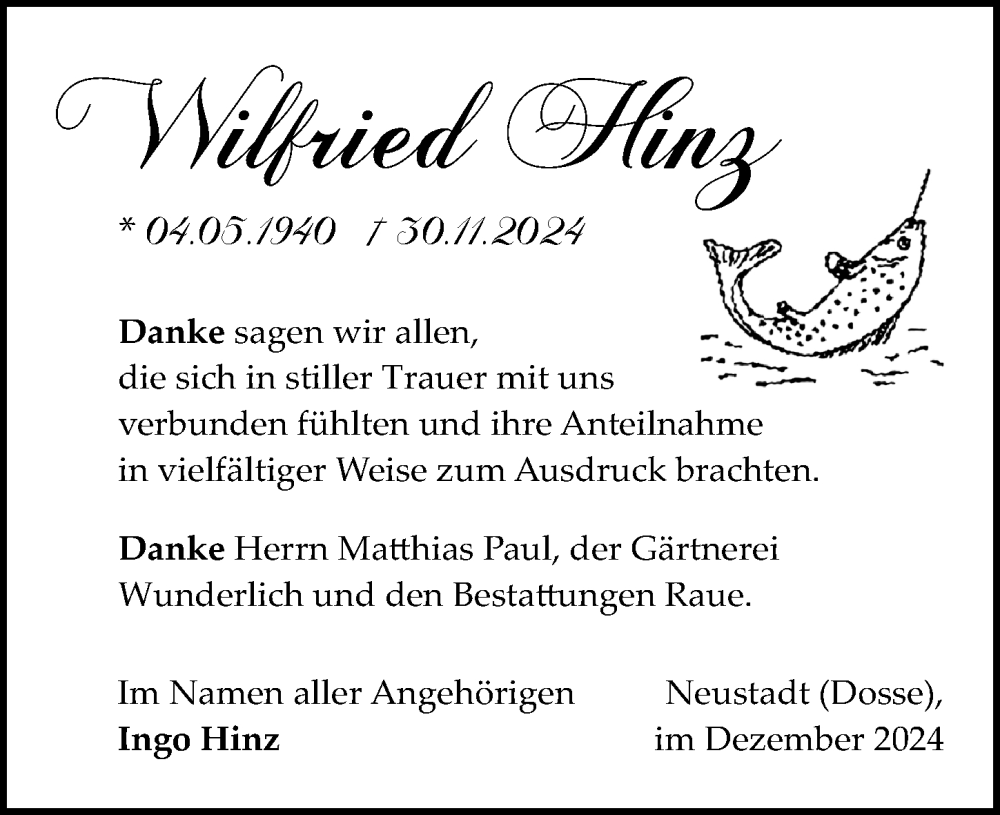 Hier finden Sie alle Traueranzeigen aus der Zeitung, die bisher für Wilfried Hinz erschienen sind. Weitere Traueranzeigen, die in der Zeitung erscheinen, werden hier ebenfalls aufgelistet