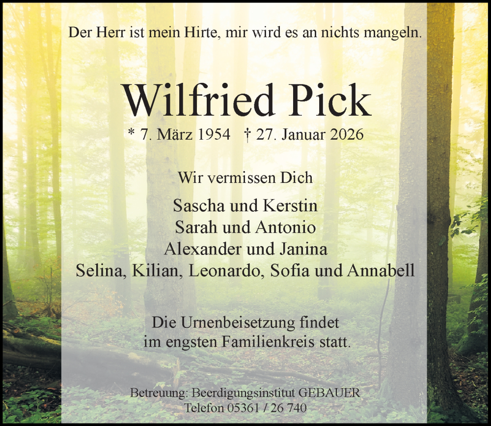 Hier finden Sie alle Traueranzeigen aus der Zeitung, die bisher für Wilfried Pick erschienen sind. Weitere Traueranzeigen, die in der Zeitung erscheinen, werden hier ebenfalls aufgelistet
