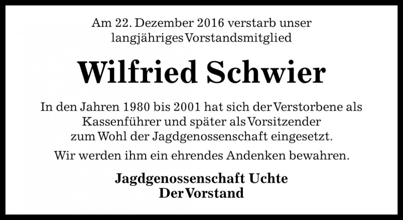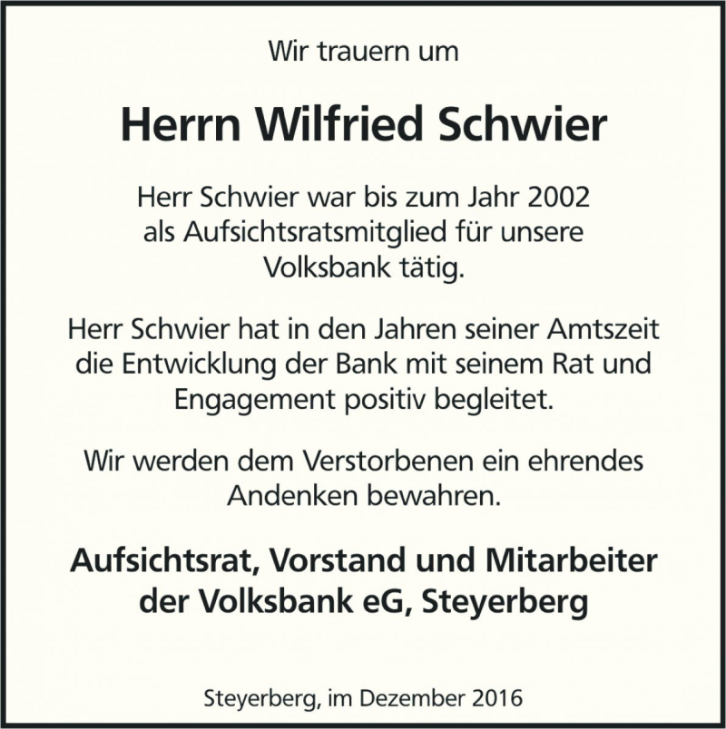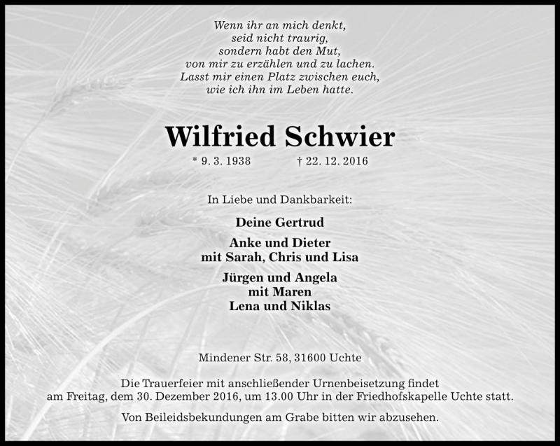 Hier finden Sie alle Traueranzeigen aus der Zeitung, die bisher für Wilfried Schwier erschienen sind. Weitere Traueranzeigen, die in der Zeitung erscheinen, werden hier ebenfalls aufgelistet