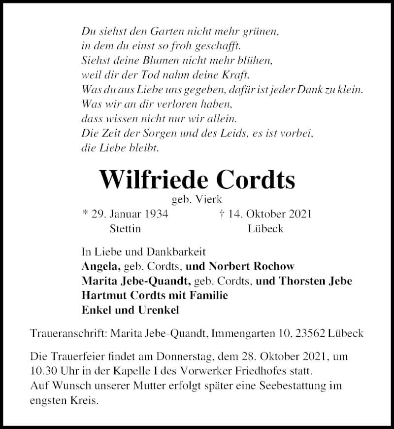 Hier finden Sie alle Traueranzeigen aus der Zeitung, die bisher für Wilfriede Cordts erschienen sind. Weitere Traueranzeigen, die in der Zeitung erscheinen, werden hier ebenfalls aufgelistet