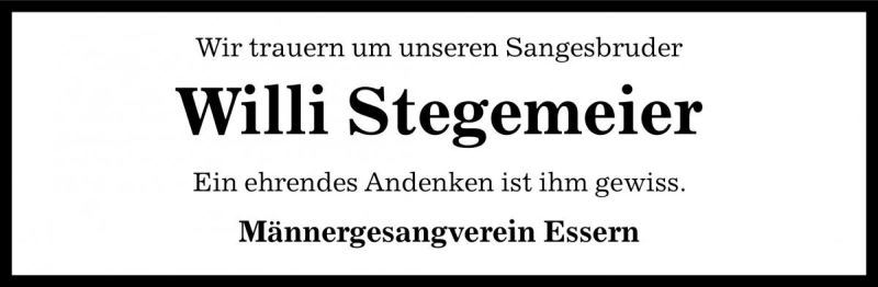 Hier finden Sie alle Traueranzeigen aus der Zeitung, die bisher für Wilhelm Stegemeier erschienen sind. Weitere Traueranzeigen, die in der Zeitung erscheinen, werden hier ebenfalls aufgelistet