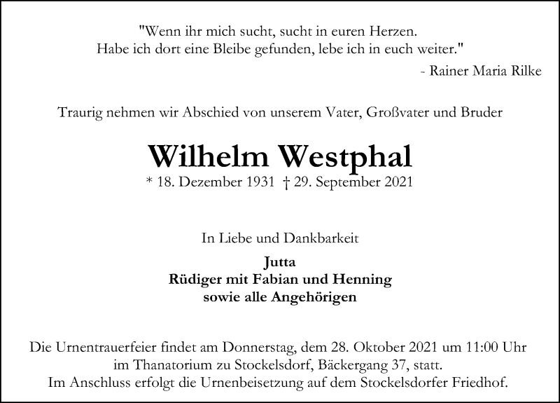 Hier finden Sie alle Traueranzeigen aus der Zeitung, die bisher für Wilhelm Westphal erschienen sind. Weitere Traueranzeigen, die in der Zeitung erscheinen, werden hier ebenfalls aufgelistet