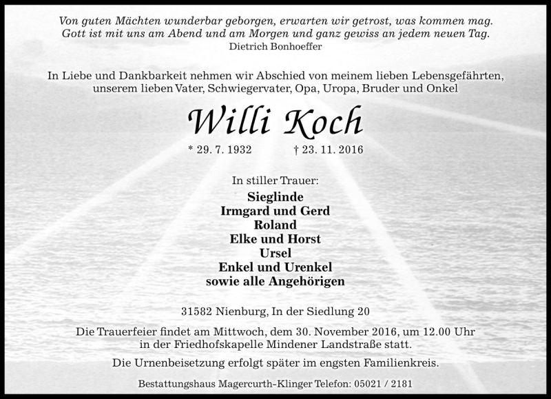 Hier finden Sie alle Traueranzeigen aus der Zeitung, die bisher für Willi Koch erschienen sind. Weitere Traueranzeigen, die in der Zeitung erscheinen, werden hier ebenfalls aufgelistet