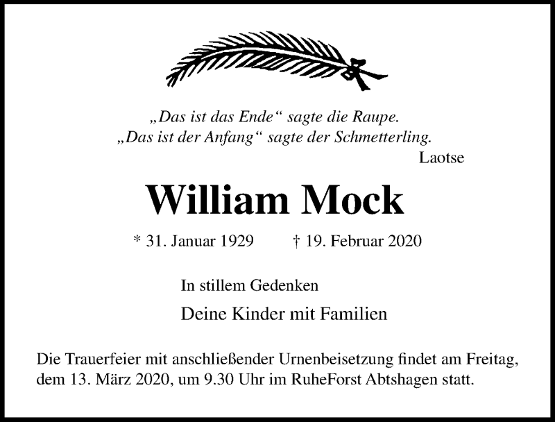 Hier finden Sie alle Traueranzeigen aus der Zeitung, die bisher für William Mock erschienen sind. Weitere Traueranzeigen, die in der Zeitung erscheinen, werden hier ebenfalls aufgelistet