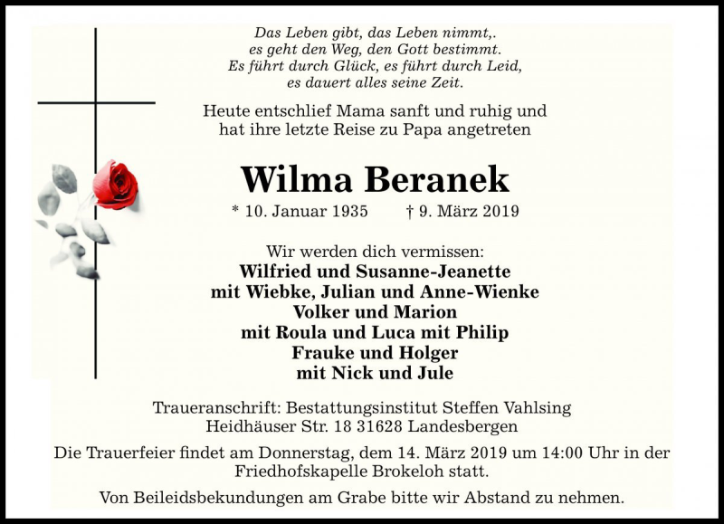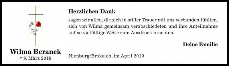 Hier finden Sie alle Traueranzeigen aus der Zeitung, die bisher für Wilma Beranek erschienen sind. Weitere Traueranzeigen, die in der Zeitung erscheinen, werden hier ebenfalls aufgelistet