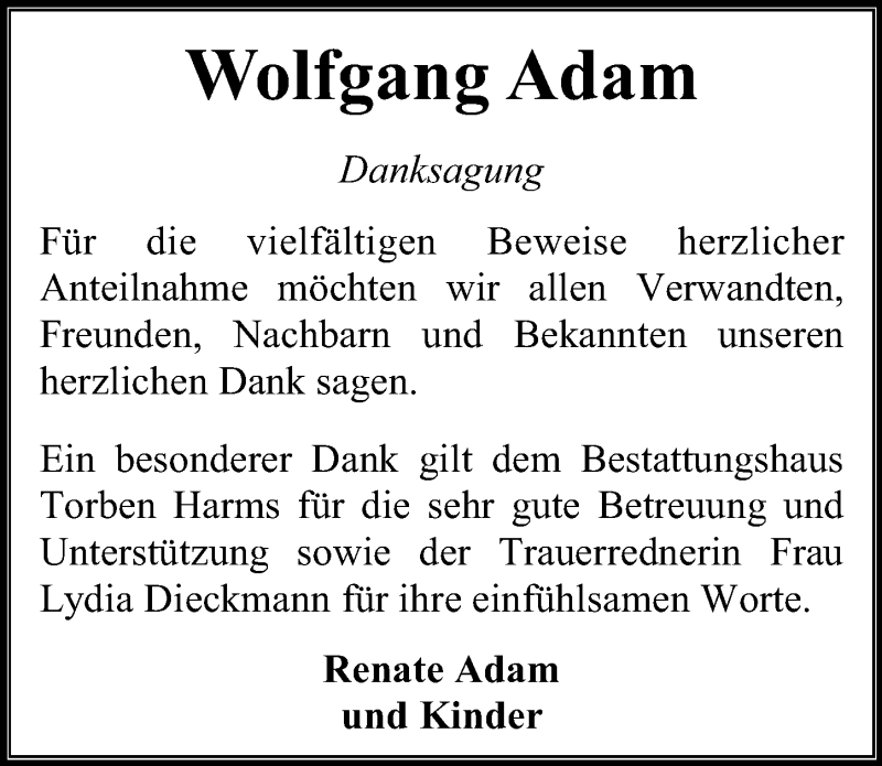 Hier finden Sie alle Traueranzeigen aus der Zeitung, die bisher für Wolfgang Adam erschienen sind. Weitere Traueranzeigen, die in der Zeitung erscheinen, werden hier ebenfalls aufgelistet