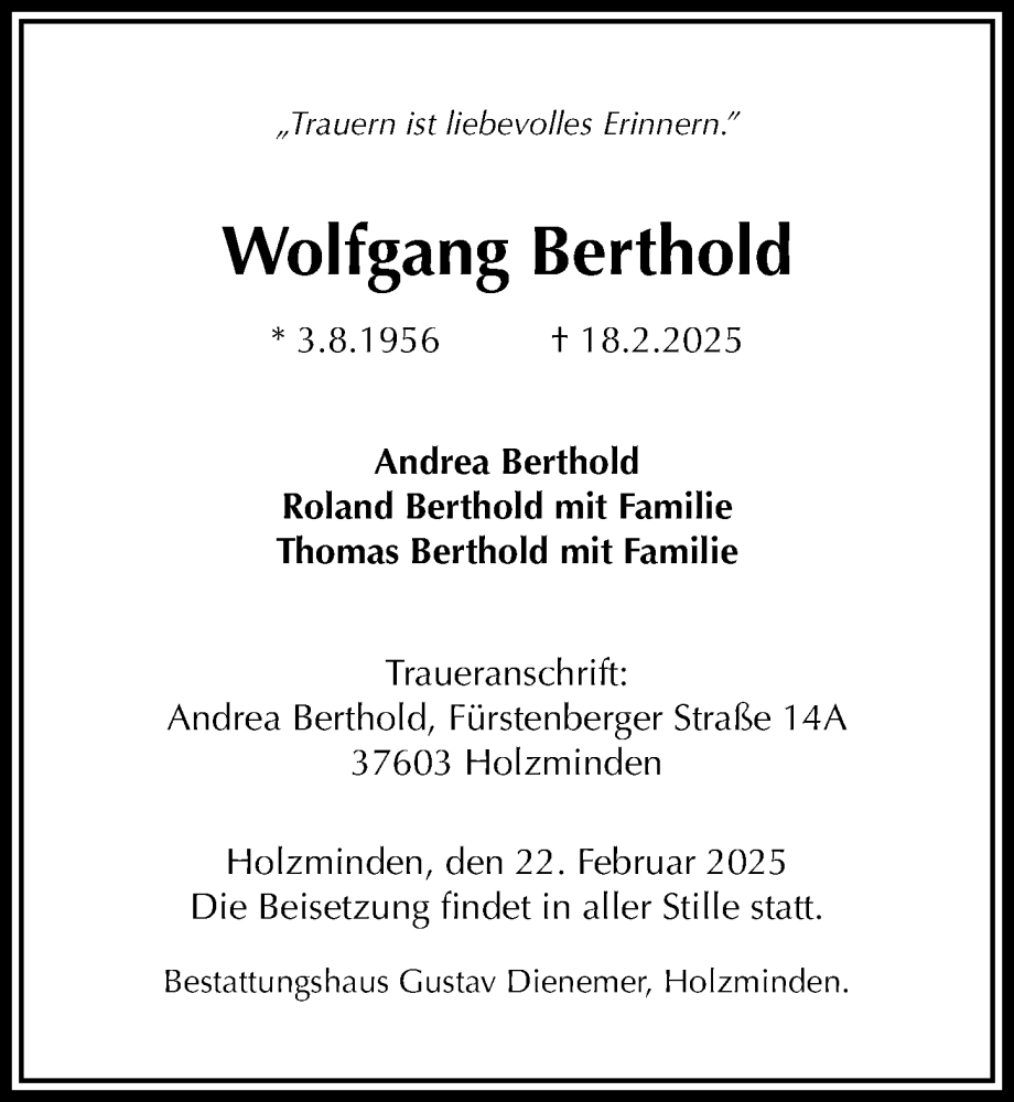 Hier finden Sie alle Traueranzeigen aus der Zeitung, die bisher für Wolfgang Berthold erschienen sind. Weitere Traueranzeigen, die in der Zeitung erscheinen, werden hier ebenfalls aufgelistet