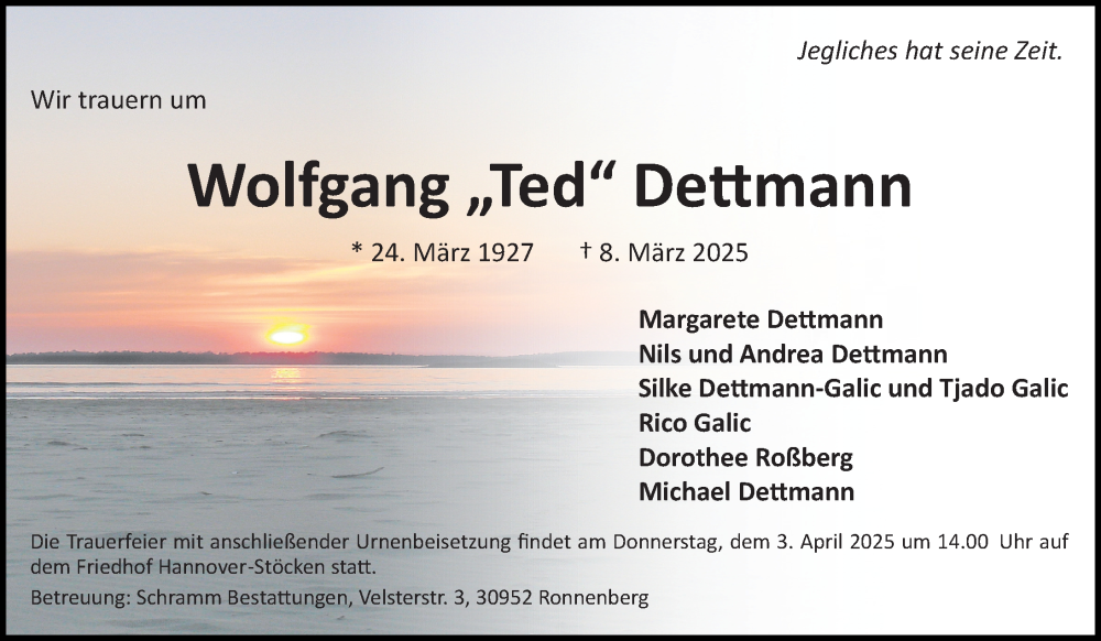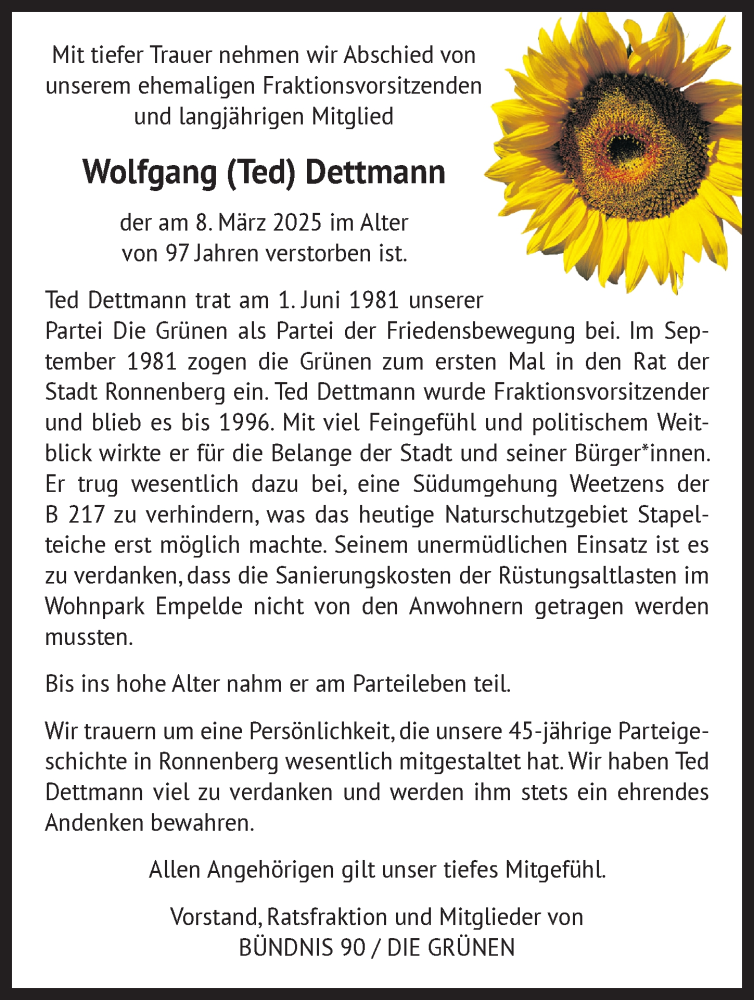 Hier finden Sie alle Traueranzeigen aus der Zeitung, die bisher für Wolfgang Dettmann erschienen sind. Weitere Traueranzeigen, die in der Zeitung erscheinen, werden hier ebenfalls aufgelistet