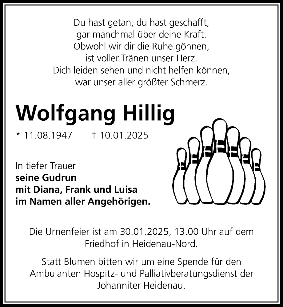 Hier finden Sie alle Traueranzeigen aus der Zeitung, die bisher für Wolfgang Hillig erschienen sind. Weitere Traueranzeigen, die in der Zeitung erscheinen, werden hier ebenfalls aufgelistet
