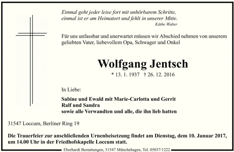 Hier finden Sie alle Traueranzeigen aus der Zeitung, die bisher für Wolfgang Jentsch erschienen sind. Weitere Traueranzeigen, die in der Zeitung erscheinen, werden hier ebenfalls aufgelistet