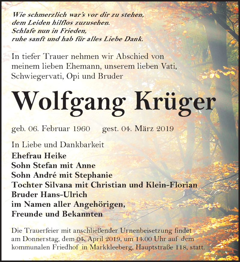 Hier finden Sie alle Traueranzeigen aus der Zeitung, die bisher für Wolfgang Krüger erschienen sind. Weitere Traueranzeigen, die in der Zeitung erscheinen, werden hier ebenfalls aufgelistet