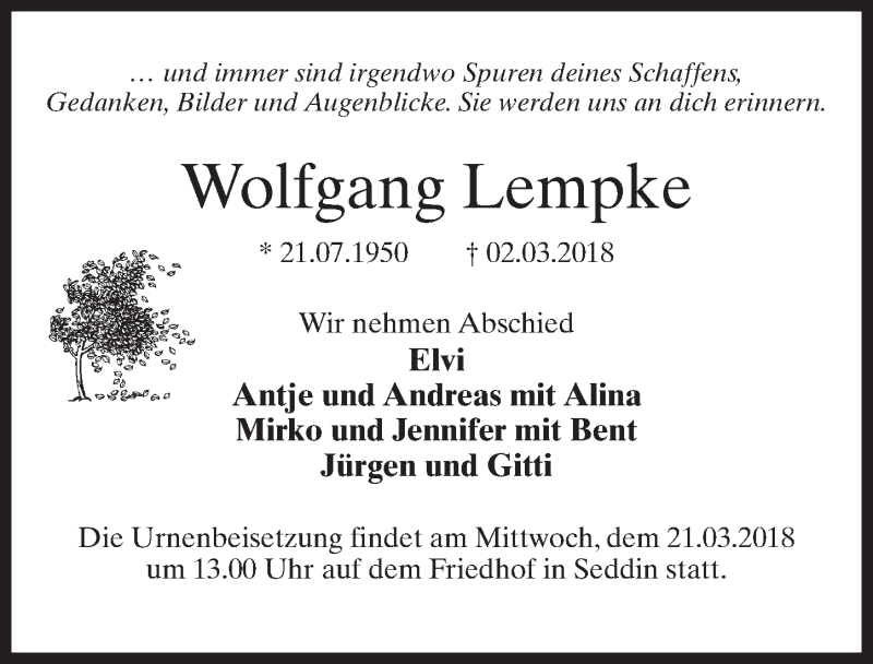 Hier finden Sie alle Traueranzeigen aus der Zeitung, die bisher für Wolfgang Lempke erschienen sind. Weitere Traueranzeigen, die in der Zeitung erscheinen, werden hier ebenfalls aufgelistet