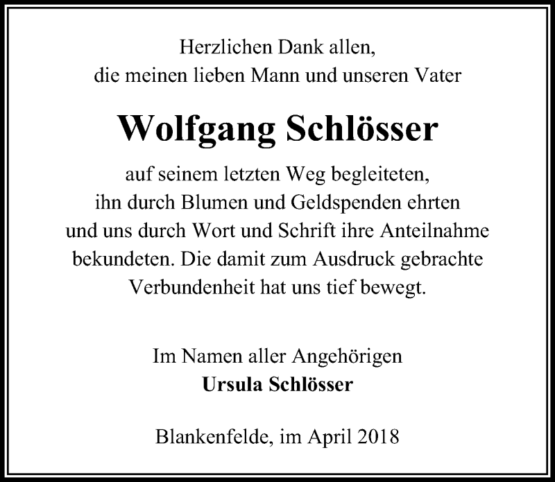 Hier finden Sie alle Traueranzeigen aus der Zeitung, die bisher für Wolfgang Schlösser erschienen sind. Weitere Traueranzeigen, die in der Zeitung erscheinen, werden hier ebenfalls aufgelistet