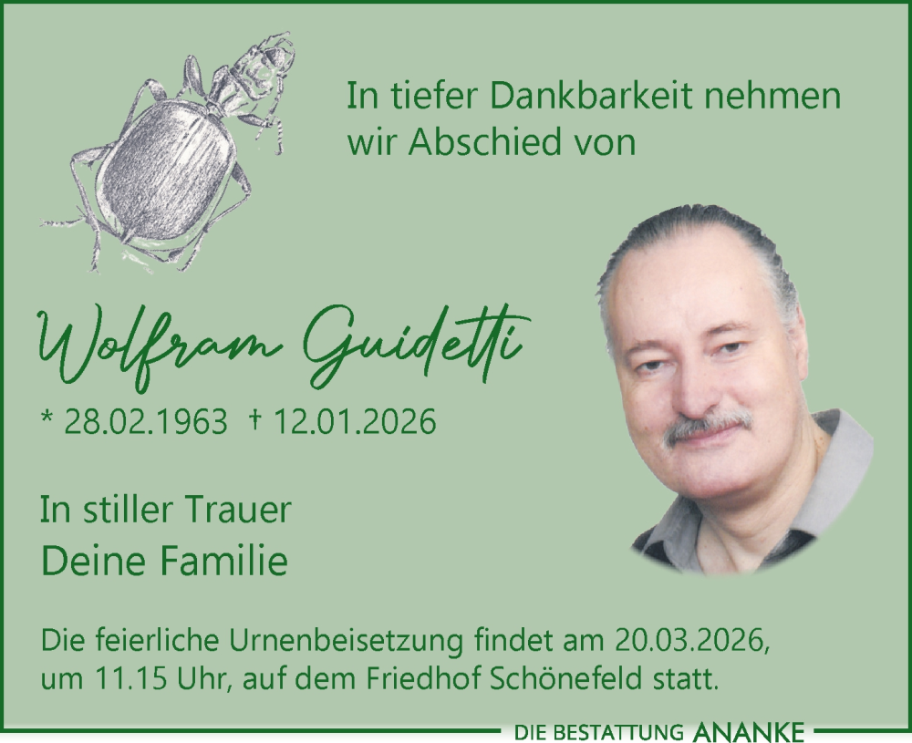 Hier finden Sie alle Traueranzeigen aus der Zeitung, die bisher für Wolfram Guidetti erschienen sind. Weitere Traueranzeigen, die in der Zeitung erscheinen, werden hier ebenfalls aufgelistet