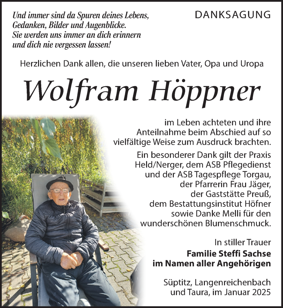 Hier finden Sie alle Traueranzeigen aus der Zeitung, die bisher für Wolfram Höppner erschienen sind. Weitere Traueranzeigen, die in der Zeitung erscheinen, werden hier ebenfalls aufgelistet